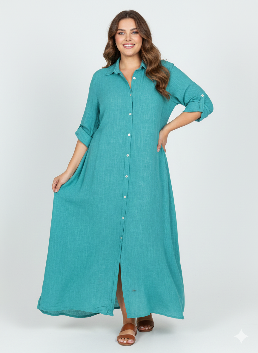 Vestido largo. Bolsillos laterales. Cuello solapa. Manga larga o 3/4 con detalle de trabilla. Cierre mediante botones.